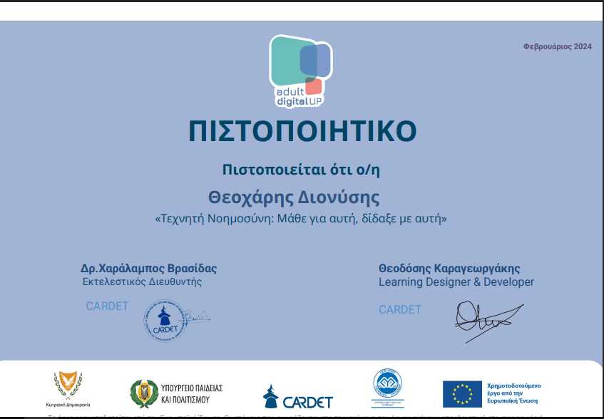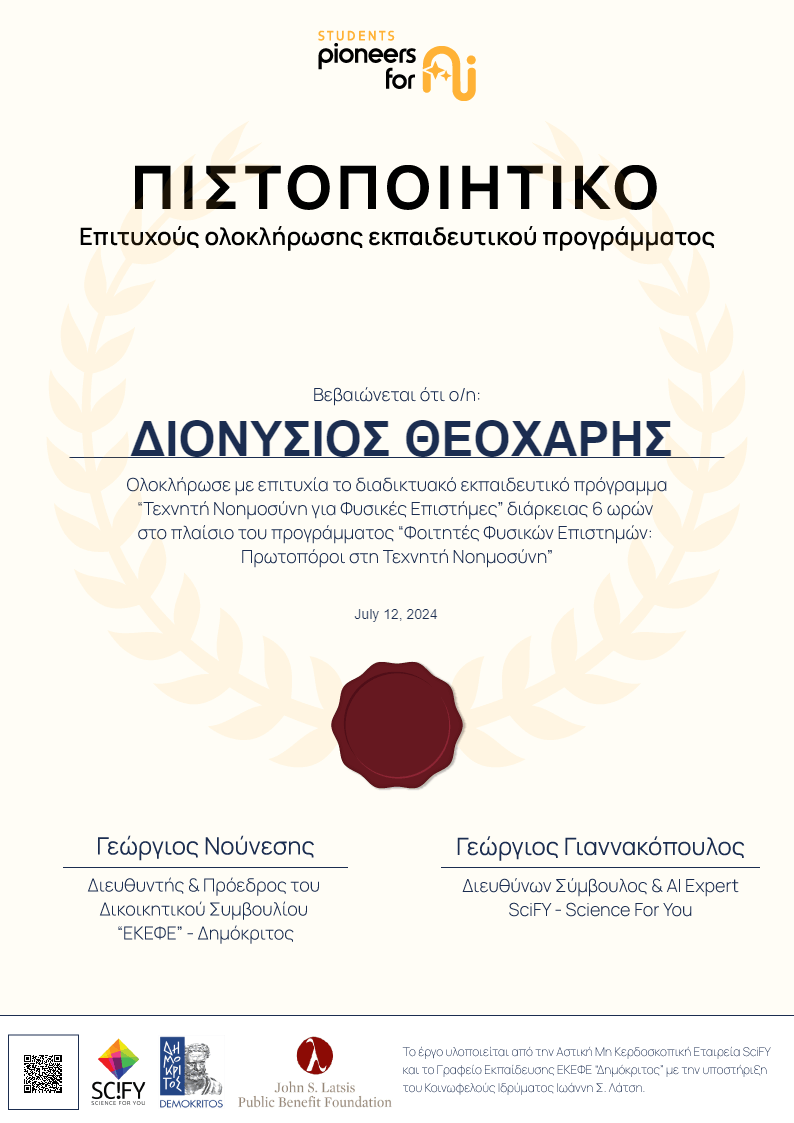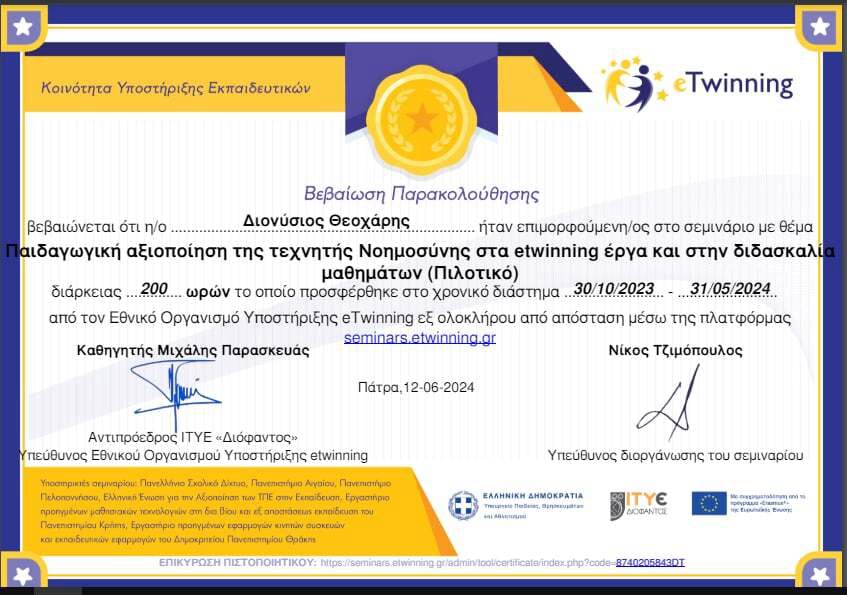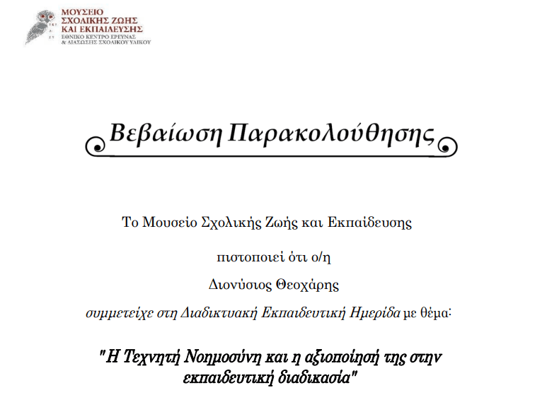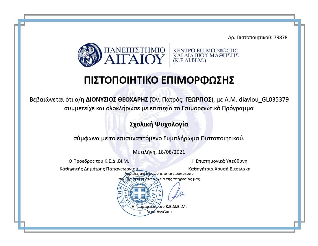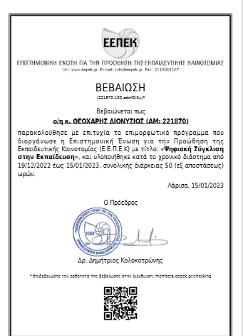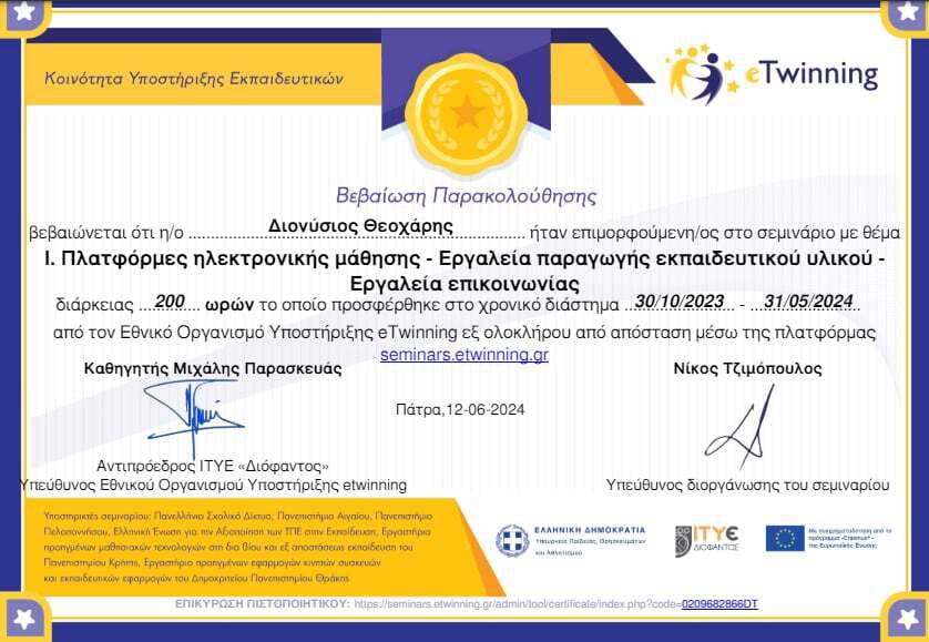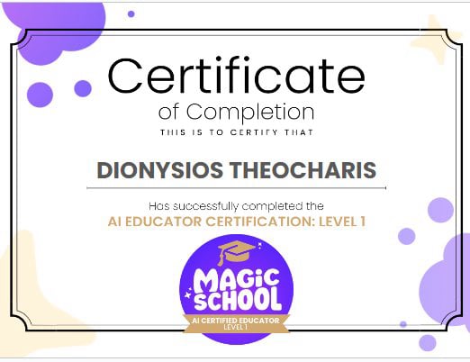 Ονομάζομαι Διονύσιος Θεοχάρης, είμαι καθηγητής μέσης εκπαίδευσης σε ιδιωτικό σχολείο στην Αττική. Είμαι απόφοιτος του τμήματος Φυσικής, του Εθνικού και Καποδιστριακού Πανεπιστημίου Αθηνών. Έχω ολοκληρώσει μεταπτυχιακές σπουδές στην Διδακτική των Μαθηματικών και στην Χρηματοοικονομική και Τραπεζική Διοικητική. Έχω πιστοποίηση σε Braille, νοηματική γλώσσα, διαπολιτισμική εκπαίδευση, σχολική ψυχολογία, Ρομποτική, social media marketing και logistics (Tuv Hellas), Ecdl, Κεφάλαιο 4 και Εκπαίδευση Ενηλίκων. Έπιπλέον έχω βραβευτεί από την Ελληνική Μαθηματική Εταιρεία το 2002 ενώ είμαι μέλος της Ένωσης Ελλήνων Φυσικών και της Ελληνικής Μένσα. Μιλάω 3 ξένες γλώσσες ενώ έχω υπάρξει ομιλητής σε αρκετά επιστημονικα συνέδρια.